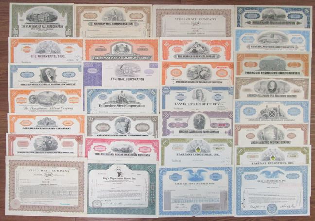NY, CA, PA, DE, OH, IN, IL, MI, NJ, VA and Others....,. Lot of 29 I/C Stocks and Bonds, Highlights include: Pennsylvania Railroad Co., Sunray Oil Corp., New York Central Railroad Co., Fruehauf Corp., Norwich Pharmacal Co., Lanvin-Charles of the Ritz, Inc., American Express Co., General Motors Corp. and more. Pieces range from Fine to AU condition. (29). Sold "AS IS" no returns accepted.