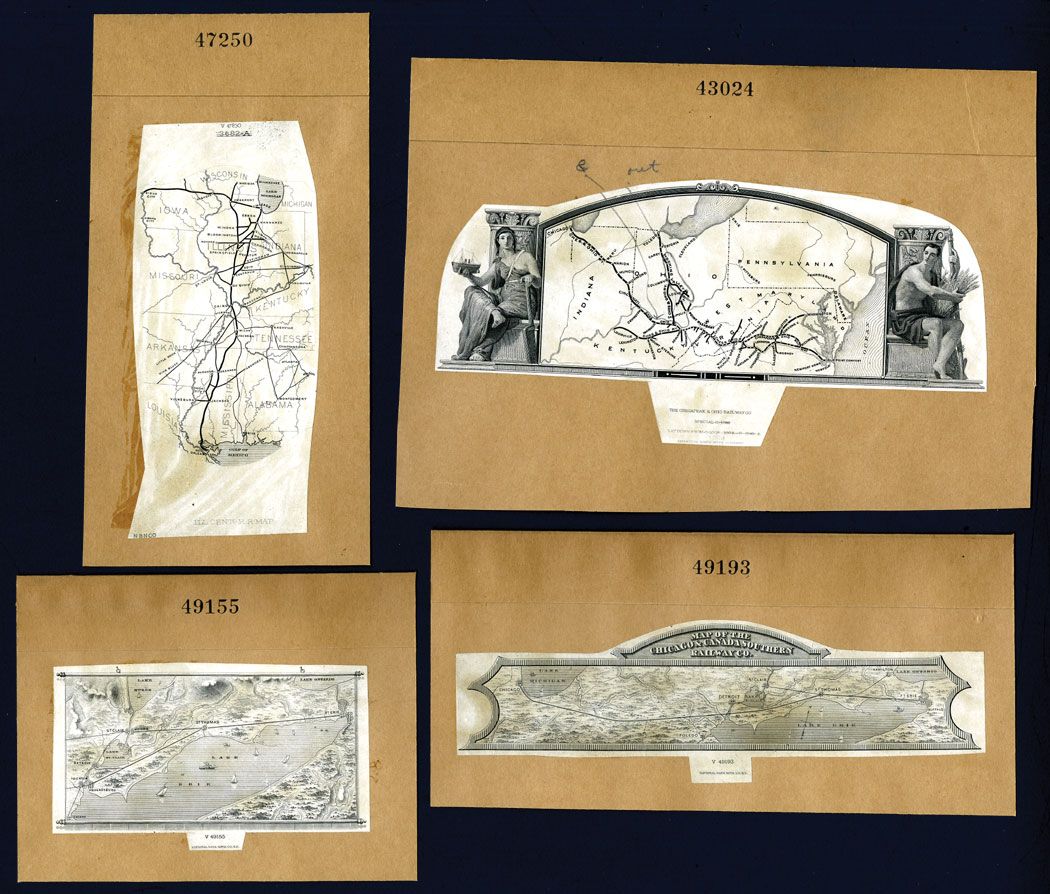 Lot of 4 Proof vignettes of maps with railroad routes on them of numerous railroads, all are printed on india and mounted on manila cards, all in XF to Au, a few with light glue stains. ABNC, NBNC.