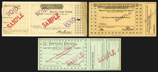 Philadelphia, Wilmington & Baltimore Monthly School Ticket; Southern Railway School Ticket; Chesapeake & Ohio Monthly ticket. All marked Sample, last two with tone, the C&O with damage at right end. 3 pieces.