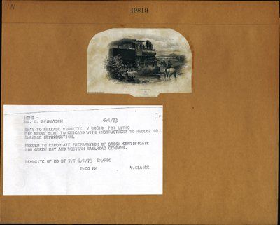 ca.1880's-1890's. 10 different proof vignettes of railroads by International BNC. All are printed on india paper and mounted on manila cards (9) or manila file folders (1). Titles include "The Fast Mail" and "The Limited" with the rest untitiled. All impressive and attractive engravings. Mostly used on stocks, bonds and checks. Condition ranges between VF up to Choice Unc. Rare group of railroad related proofs. IBNC.