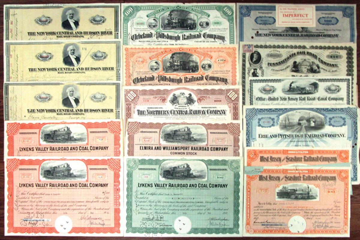 NY, PA, MD, OH, NJ, MI, IN, & IL, 1900-59. Assortment of 15+I/C Stock Certificates from various railroads, Including: New York Central and Hudson River Rail Road Co., Elmira and Williamsport Railroad Co., Northern Central Railway Co., Cleveland and Pittsburgh Railroad Co., Lykens Valley Railroad and Coal Co., Erie and Pittsburgh Railroad Co., West Jersey and Seashore Railroad Co., United New Jersey Rail Road and Canal Co., Pennsylvania Rail Road Co., and New York Central Railroad Co. Pieces range from Good-Fine condition. (16). Sold "AS IS" no returns accepted.