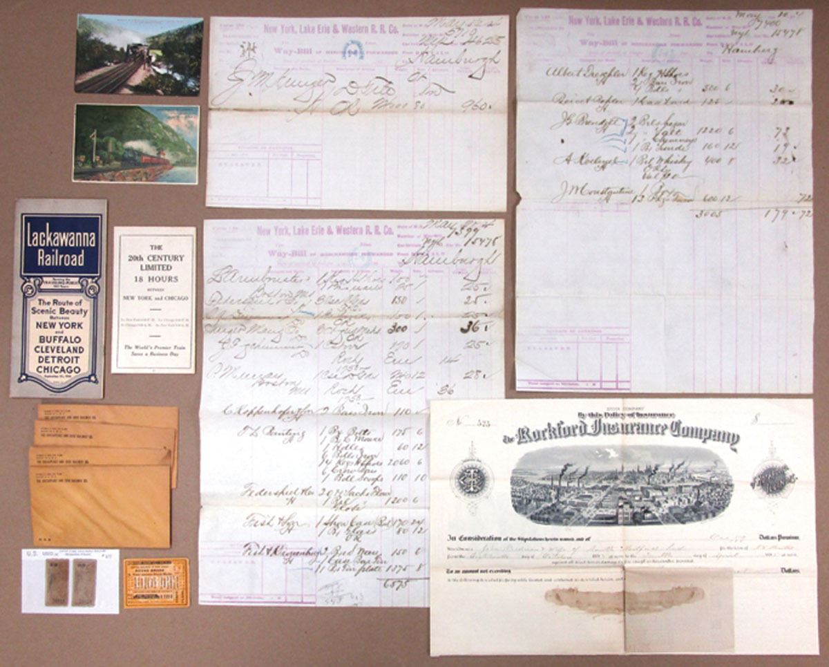 Illinois, New York, Ohio and Massachusetts, ca. 1884 to 1936, Lot of 15 Railroad related items, includes postcards, train tickets, maps, Time Tables, and more. Items range from Fine to XF condition. Time Tables include a 1936, Lackawanna Railroad with illustrated and ornate map; a 1932, New York Central, Hudson Division timetable; ND (ca.1880-90s) Staten Island Rapid Transit Railway Ticket pair; 3 different, 1884, NY, Lake Erie & Western R.R. Co., Way Bills; Two different Railroad Postcards, ca.1920-30s; ad other items. (15). Sold "AS IS" no returns accepted.