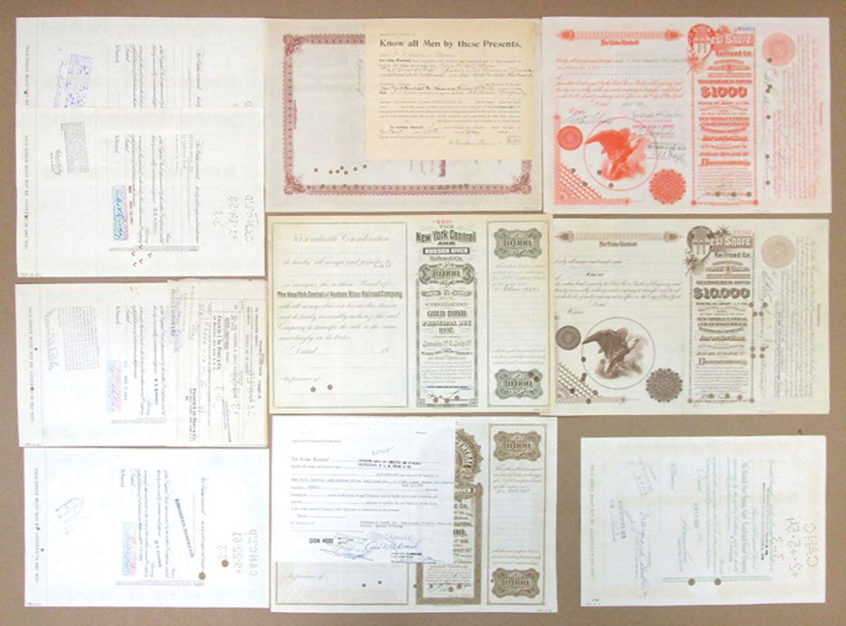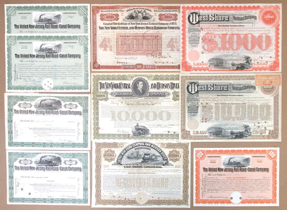 Lot of 10 I/C Stocks and Bonds, Includes: United New Jersey Rail Road and Canal Co., 1953-1961, Group of 5 I/C Stock Certs; West Shore Railroad Co., 1917-1942, Pair of 2 I/C Bonds; New York Central and Hudson River Railroad Co., 1903-1956, Group of 3 I/C Bonds. Documents range from Fine to VF condition. (10). Sold "AS IS" no returns accepted.