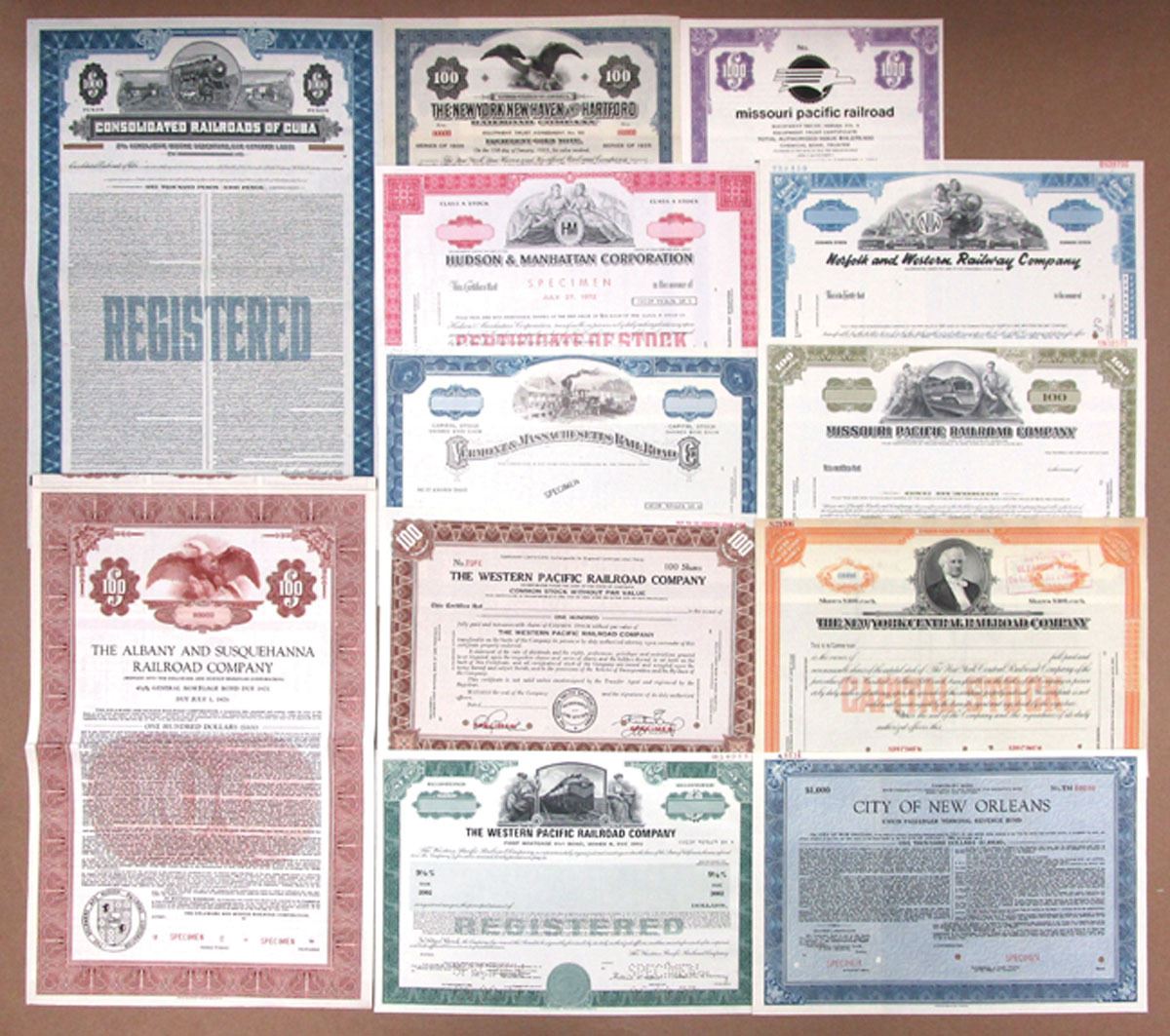 Lot of 12 Specimen Stocks and Bonds, Includes: NY, New York, New Haven and Hartford Railroad Co., 1920; Cuba, Consolidated Railroads of Cuba, ND (1950s); NY, Albany and Susquehanna Railroad Co. 1945; NY & NJ, Hudson & Manhattan Corp., 1972; MA, Vermont & Massachusetts Railroad, 1978; CA, Western Pacific Railroad Co., 1977; VA, Norfolk and Western Railway Co., ND (1950s); NY, New York Central Railroad Co., ND (1940s) and more. Certificates are all marked Specimen with either overprints or POCs and range from VF to AU condition, many with vignettes, ((12). Sold "AS IS" no returns accepted.