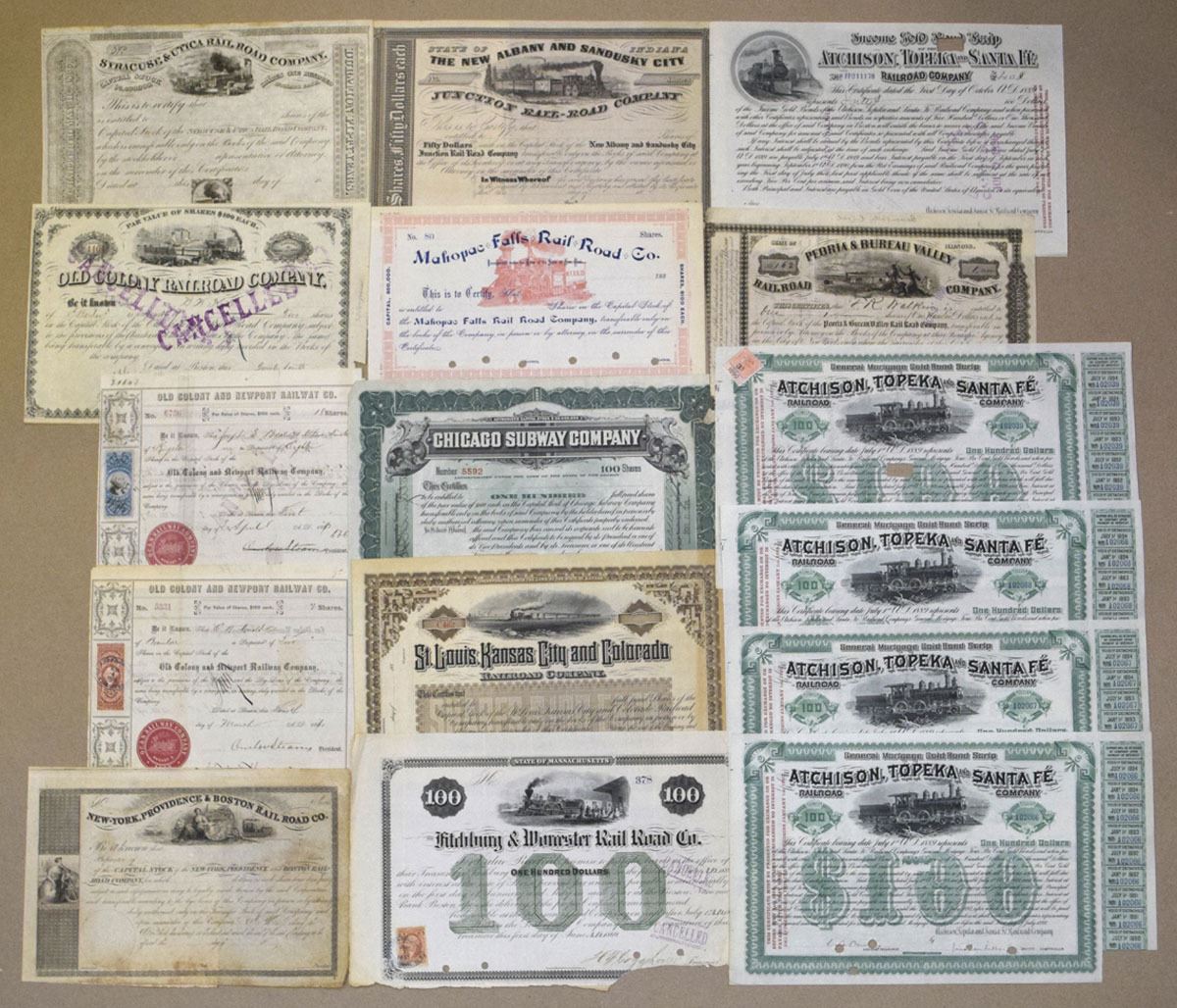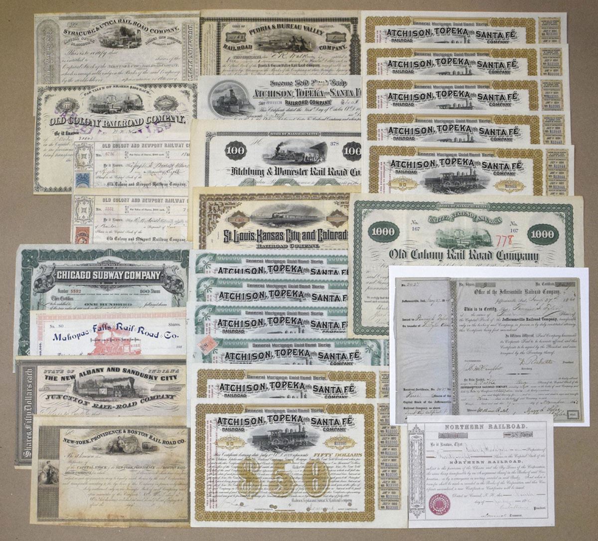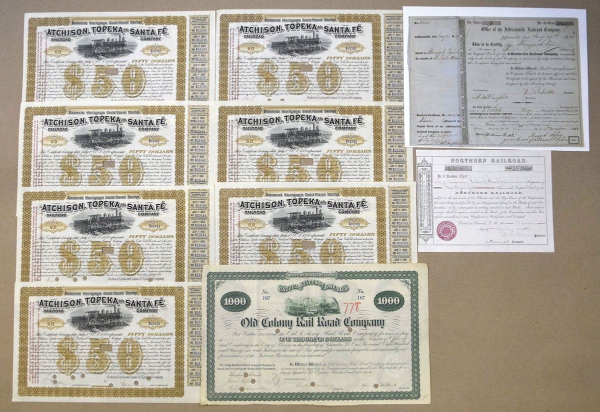 Various States, 1850s-1920s. Lot of 25+ I/C, U/C, and U/U stock and bond certificates from U.S. railroad companies, highlighted by multiple early examples from the Atchison, Topeka & Santa Fe Railroad Co. (including both $50 and $100 denomination bond certificates with classic locomotive vignette). Other companies represented include: Syracuse & Utica Rail Road Co.; Peoria & Bureau Valley Railroad Co.; Fitchburg & Worcester Rail Road Co.; Old Colony Railroad Co.; Old Colony & Newport Railway Co.; St. Louis, Kansas City & Colorado Railroad Co.; Chicago Subway Co.; Malopois Falls Rail Road Co.; New Albany & Sandusky City Junction Rail Road Co.; New York, Providence & Boston Rail Road Co.; Office of the Jeffersonville Railroad Co.; and Northern Railroad. Vignettes feature locomotives, allegorical figures, and ornate borders, with several 19th century engraved designs. Conditions vary from Good to Very Fine. (25+). Sold "AS IS" no returns accepted.