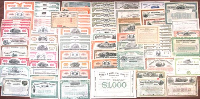 Various Issuers and states....., ca.1870-1978. Lot of 80 colorful Stock and Bond Certificates, Includes I/C, I/U, an U/U, Highlights Include: Brooklyn, and Queens Transit Corp.; Baltimore and Ohio Railroad Co.; Erie Railroad Co.; Penn Central Co.; Chicago, Rock Island and Pacific Railroad Co.; and more. Certificates range from VF to Uncirculated condition. (80). Sold "AS IS" no returns accepted.