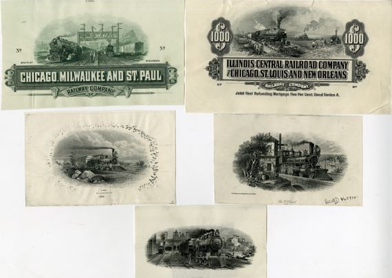 Lot of 5 Railroad Locomotive Proof Vignettes and Stock and Bond Headers, Includes: Chicago, Milwaukee and St. Paul Railway Co. Header used on Stocks and Bonds in Green; Illinois Central Railroad Co. and Chicago, St. Louis and New Orleans Railroad Co. Header used on Stocks and Bonds in Black; Franklin Bank Note Co. Railroad Vignette "Vignette 421"; Home Lee Bank Note Co. Railroad Vignette "V 49007"; and Homer Lee Bank Note Co, Locomotive Vignette "The R.R. Signal." All are LPD, printed on India paper, and range from VF to XF condition. (5). Sold "AS IS" no returns accepted.