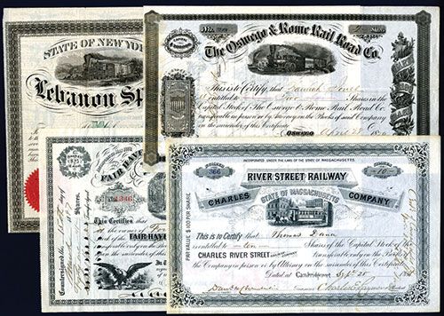 1). Charles River St Railway Co., Issued Stock, VF condition. 2). Oswego & Rome Rail Road Co., Issued Stock, VF condition. 3). Lebanon Springs Rail Road Co., Issued Bond, VF condition. 4). Connecticut, 1897, I/C, Vignette of Fairhaven top center, POC's, VF condition. Listed railroad and stock in Cox. (5)