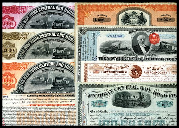 Railroad Stocks and Bonds, Misc Assortment, Early to Mid 20th Century I/C, Etc., (9) Certificates. All Different. Michigan Central RR; NY & Harlem; NY Central; Pennsylvania RR; NY Central & Hudson; West Shore RR; Colorful and Historical. Average VF+. (9)