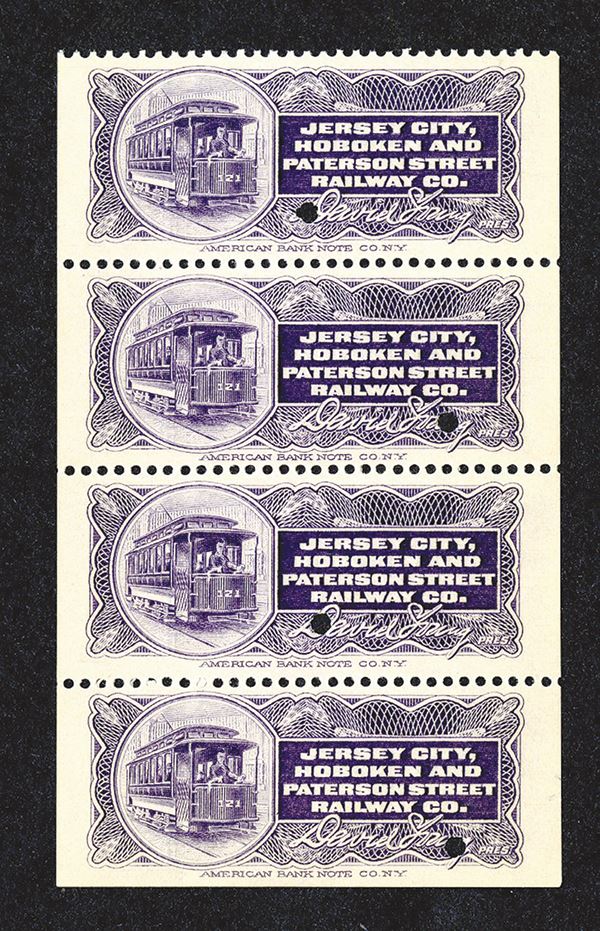 NJ. Jersey City, Hoboken and Paterson Street Railway Co. Streetcar at left. Strip of four Specimen tickets, #17-20 on back. POC.