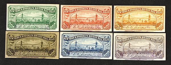 NY. New York & Brooklyn Bridge Rail Road. Great view of the bridge over the East River. Colors include: Rose, Orange, Purple, Black, Blue, Green. Hand stamped SPECIMEN. All but black is uniface. All formerly mounted. Hamilton BNC. 6 pieces.
