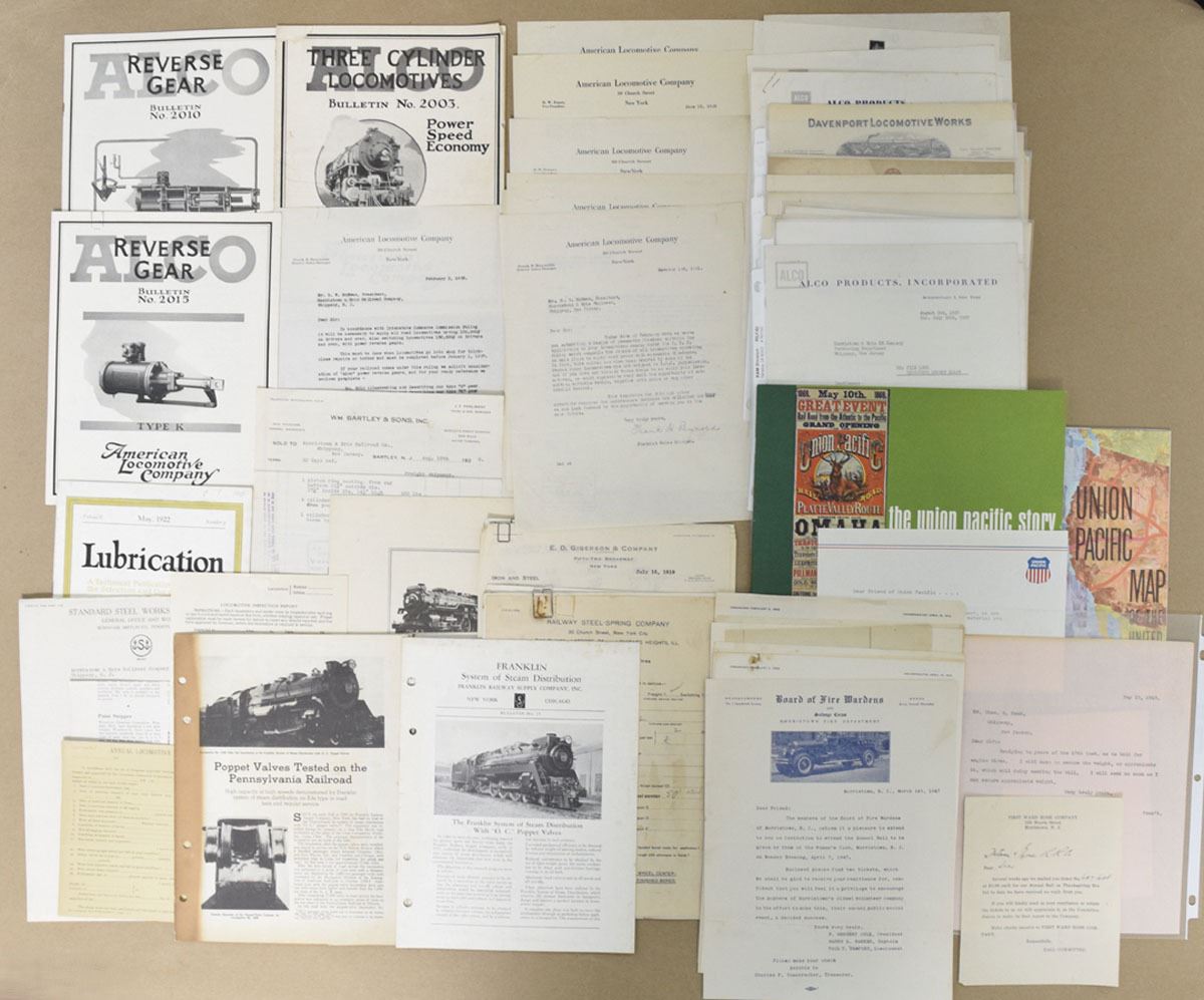 Various States, Lot of 65+ documents featuring a diverse selection of railroad and locomotive-related ephemera, including technical bulletins, company letters, promotional brochures, and inspection reports from major American locomotive manufacturers and related companies. Highlights include American Locomotive Company bulletins Reverse Gear Nos. 2010 and 2015, and Three Cylinder Locomotives, illustrated with technical diagrams and locomotive imagery, company correspondence and letterheads from Alco Products, Electro-Motive Division, General Electric Company, Lima Locomotive Works, Brookville Locomotive Company, and H.K. Porter Company, many dated between the 1920s and 1950s, promotional brochures such as The Union Pacific Story and Union Pacific Map of the United States, engineering and technical sheets from Railway Steel-Spring Company, Franklin System of Steam Distribution, and Standard Steel Works Company, inspection and repair reports, invoices, and Western Union telegrams related to locomotive operations and parts orders, offering an excellent and wide-ranging archive for the railroad historian or industrial ephemera collector. (65+). Sold "AS IS" no returns accepted. (Garden State Railroad Collection).