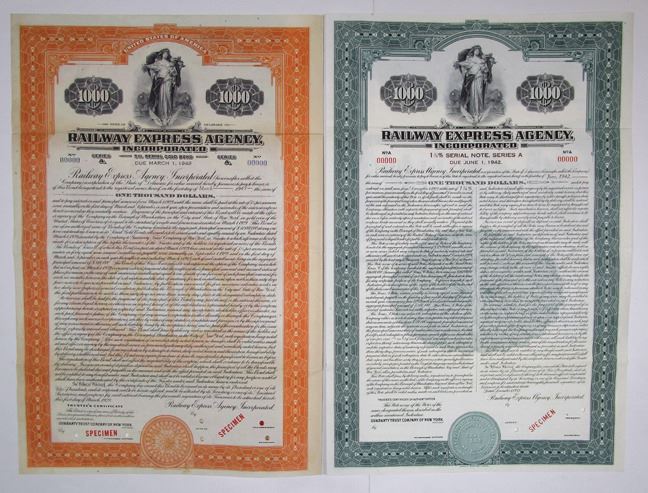 Delaware, 1929-38. Lot of 2 Specimen Bonds, Includes: 1929, $1000, 5% Coupon Bond, Black on orange border and underprint; and, 1938, $1000, 1 3/8% Coupon Bond, Black on green border and underprint, both with Specimen overprints and POCs. VF to XF condition, ABNC. (2). Sold "AS IS" no returns accepted.