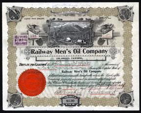 Los Angeles, California. 1900. 5 Shares, #439, Gold, green and Black, Cabin with mountain scene on top, underprint in green of oil wells, 4 corners with circular mining scenes and red seal. Issued and uncancelled. Rare LA oil certificate.