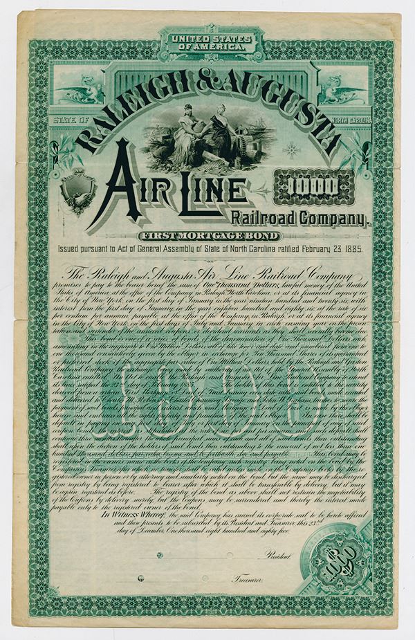 North Carolina. $1,000, bond, allegorical females hold hands top, vertical format, 1st mortgage, bearer coupon, 6%, 40-yr, 1885, due 1926.
