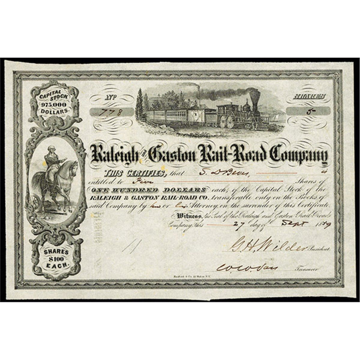 North Carolina, 1859, 5 Shs., Washington on horseback left, Train, VF+.