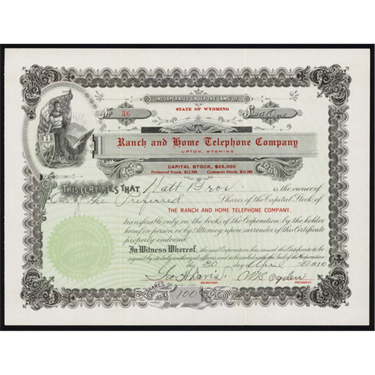 Upton, Wyoming, 1910, 1 Preferred Share, Issued and uncancelled but endorsed on back, Standing Liberty with eagle, flag and Wyoming arms on left, Cert.#36, rare Wyoming telephone company, XF condition.