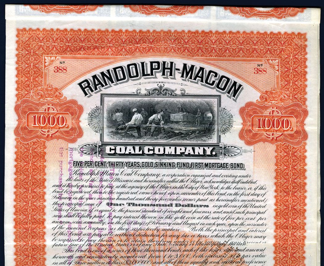 New York, 1905, $1000, 5% 1st Mortgage Gold Bond, Issued and uncancelled, Black with orange-red border and underprint, Miners and coal car on top, S/N 388, Coupons attached, XF condition, ABNC.