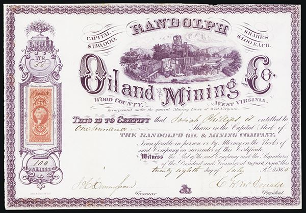 1865. Oxford, Pennsylvania. Issued and uncancelled stock certificate. 100 Shares. Stunning bright purple on white. Vignette of oil well scene in middle circled by ornate title and counterfoil on left with 25 Cents U.S. I.R. 1st Issue stamp. Appears in XF condition but margins cut close. Stein & Jones Printer. Rare oil stock certificate.