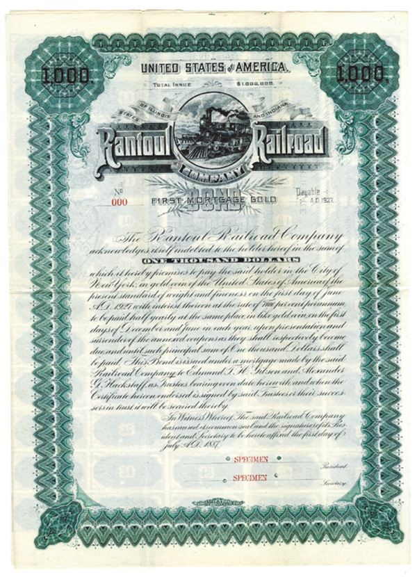 Illinois & Indiana. $1000 Specimen 5% 1st Mortgage Gold Coupon Bond, Black print on large green border and under tint, Locomotive engine at top in company title, Specimen overprints and POC's, Fine-VF condition, Homer Lee BNC.