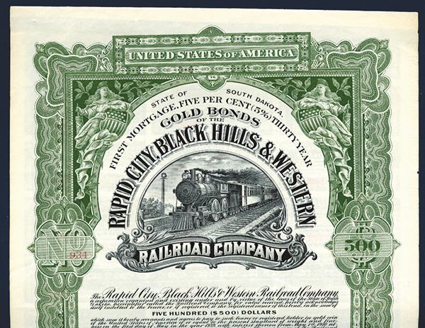 South Dakota. $500 Issued 1st Mortgage 5% 30 Year Gold Bond in Vertical format with Coupons attached. I/U. Black print with very ornate green border and under print. Vignette of moving locomotive at top center. VF condition, Globe Lithe Co. Listed railroad and bond in Cox.