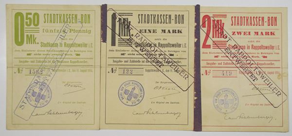 Germany. 1914. Lot includes a trio of 50 Pfennig, 1 Mark, and 2 Mark Notgeld, all with validation handstamps and signatures, also cancellation handstamp with "ENTWERTET" text. VF. All rare. (3)