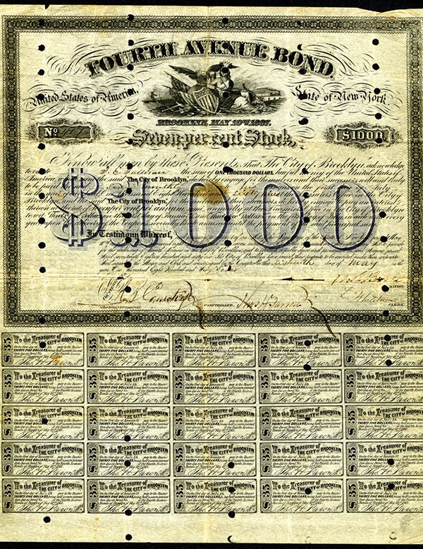 Rare City of Brooklyn Bond. 1867. Fourth Avenue Bond. Seven per cent stock. Violet $1000. There are numerous hole punch cancels and a few stains, but this is the only example this cataloger has ever seen.