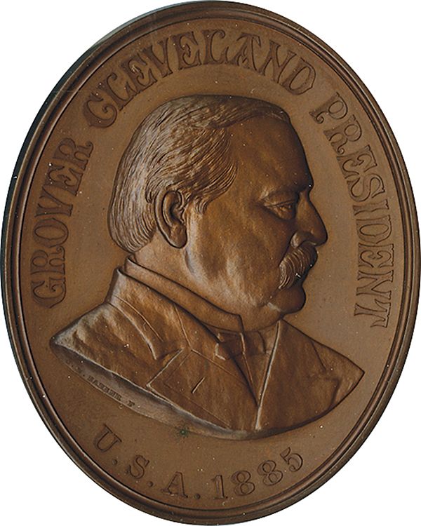 Rare Grover Cleveland Indian Peace Medal. 1885. Grover Cleveland Indian Peace medal. Julian IP-46. Oval. Bronze. NGC graded MS 65 BN. 59.0 mm. x 75.0 mm. Lovely chocolate brown surfaces throughout, with none of the usual contact marks or rim bruises usually associated with pieces of this size. The obverse, engraved by Charles Barber, features a portrait of Grover Cleveland based on photos received at the mint in January of 1885. The reverse was engraved by George Morgan. One of the rarest U.S. Mint Indian Peace medal series. Only 30 pieces were struck in bronze, and 10 in silver. John Ford owned one specimen, sold in Ford XVIII for $3,967.50. Stack’s sold another example described as VF with “small nicks on both sides” in their January 12, 2009 American Sale for $4,025.The current example is vastly superior in grade and general overall appearance, and perhaps the finest known. Rarely seen in even the finest collections, and certainly worthy of a premium bid.
