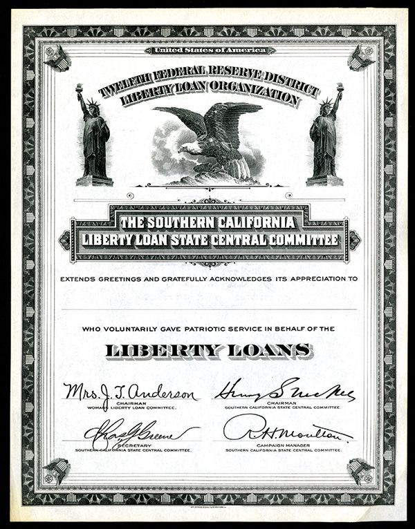 Rare Southern California Liberty Loan Certificate. Twelfth Federal Reserve District Liberty Loan Organization - Southern California Liberty State Central Committee certificate of appreciation. 8 1/2" by 11." Eagle flanked on both sides by the Statue of Liberty. Shields in the borders. W. P. Jeffries Co. XF. Unissued. Only one this cataloger has seen.