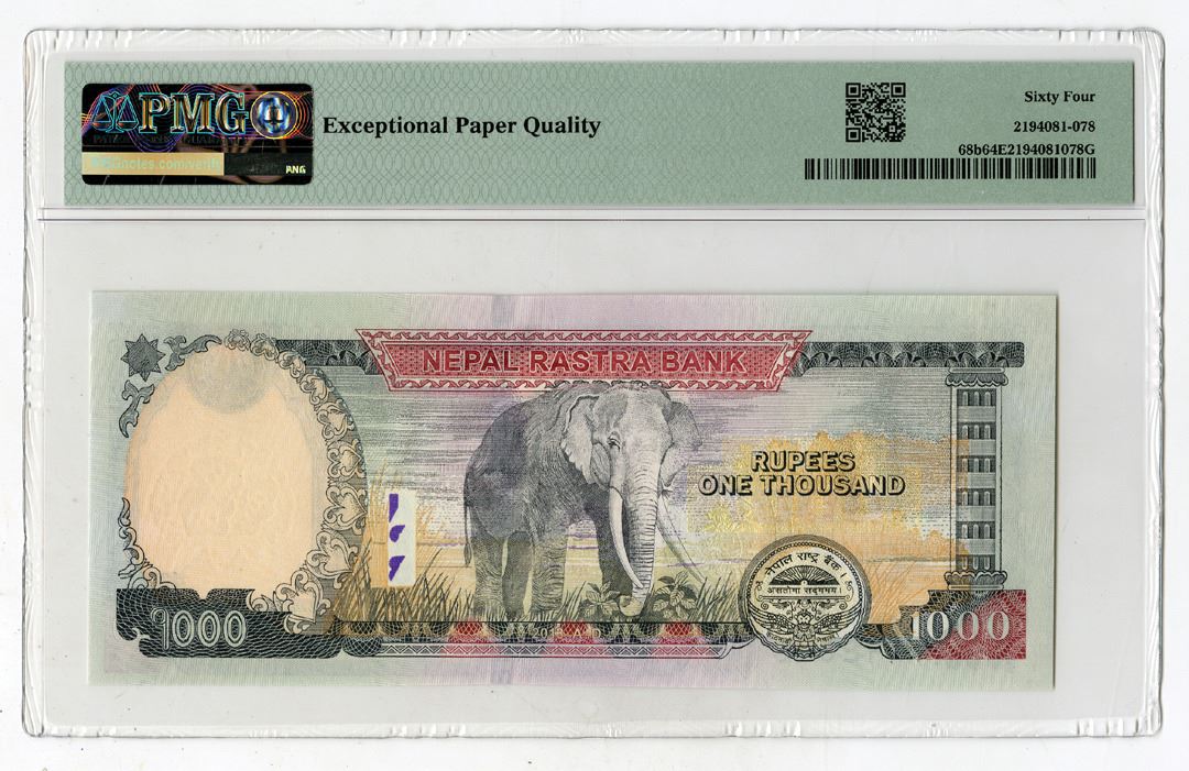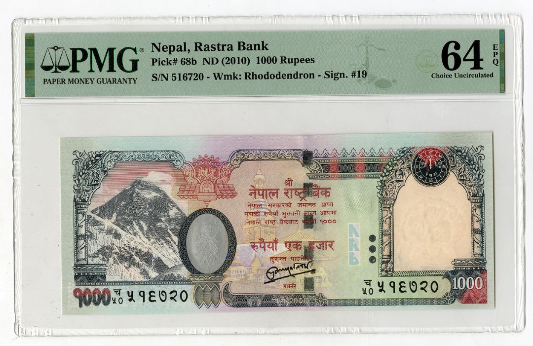 Nepal, ND (2010). 1000 Rupees, P-68b, Issued Banknote, Blue and brown on m/c underprint, Mt. Everest at left and Swayambhunath stupa at center, Back is m/c with an elephant at center, S/N 516720, PMG graded Choice Uncirculated 64 EPQ.