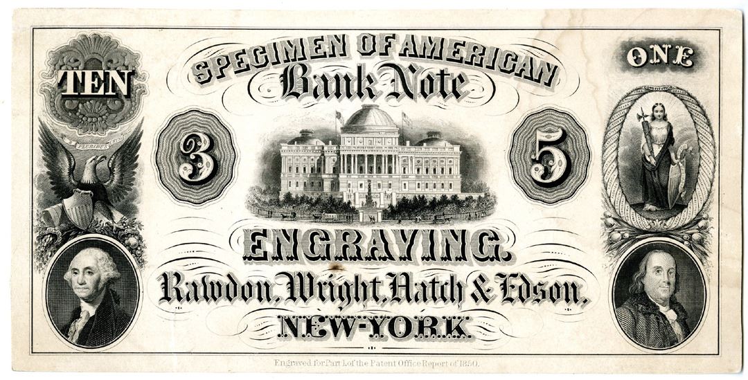 New York, 1850, Multi-vignetted ad note stating "Specimen of American Bank Note Engraving, Rawdon, Wright, Hatch & Edson, New York" with small print underneath on the margin "Engraved for Part 1. of the Patent Office Report of 1850", Back bank, Printed in black on thin off white card, Washington and Franklin portraits on the lower left and right, Eagle left, Allegorical Liberty at right with capital building in middle flanked by denomination counters "3" and "5". AU condition with slight water staining on the middle right, still very attractive for its age. Historic security printer ad note. RWH&E.