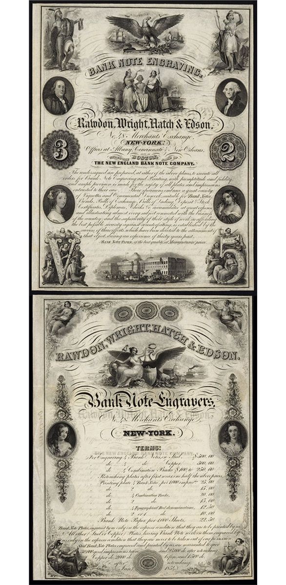 New York; New Orleans; Cincinnati, Boston, 1854, 2 page advertising booklet or broadsides with ornate and detailed vignettes and designs listing information about the company as well as prices for printing banknotes. Young women on left and right with allegorical women in corners with large patriotic eagle and allegorical woman in middle; the second page has portraits of Franklin and Washington, eagle, Native Americans, Numerals with young men and women on bottom corners, large building on bottom. XF condition and a superior example for this issue that is rarely seen this fresh and nice. RWH&E.