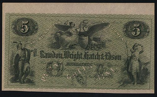 Cincinnati, Ohio. 1851 (ca.1859). 5 Denomination ad note with green security undertint on very light tan paper from 1859 Cincinnati Directory. Undertint in green also has additional lettering “American Bank Note Company, Patent Green Tint. Ornate lettering and text describing the items produced by this well known early banknote engraver that eventually was one of the founding companies of the American Bank Note Company formed in 1859. Rare and attractive ad note. Choice to Gem Uncirculated condition. RWHE.