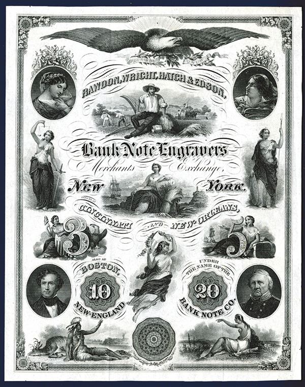 New York, NY. Cincinnati and New Orleans. 8 1/4" x 10 1/4". Glorious eagle on top. Multiple portraits, allegorical figures, numerals and Native Americans adorn this rare and lovey advertising sheet. VF-EF. RWH&E.