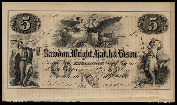 Rawdon, Wright, Hatch & Edson Engravers Ad Note. Cincinnati, Ohio. 1851. 5 Denomination ad note from 1851 Cincinnati Directory. Impressive engraved note with Native American man on left, Allegorical woman in middle top with eagle and Native American woman on right with spear and Bow. Ornate lettering and text describing the items produced by this well known early banknote engraver that eventually was one of the founding companies of the American Bank Note Company formed in 1859. Rare and attractive ad note. Printed on light brown paper. AU condition with minor toning on the right margin. RWHE.