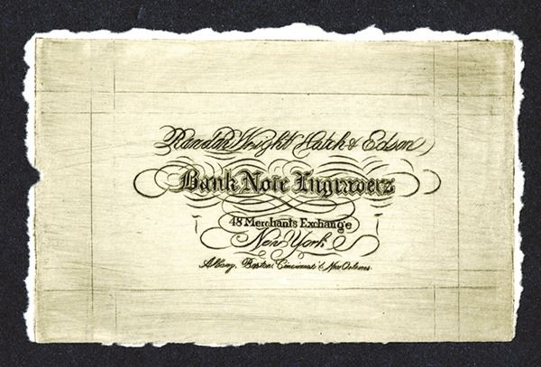 New York, ND, (ca.1840-50), 2 x 3 inches, black with engraved guide lines, Address on card is "48 merchants Exchange, New York", also includes additional card handwritten for another engraving firm. RWH&E.