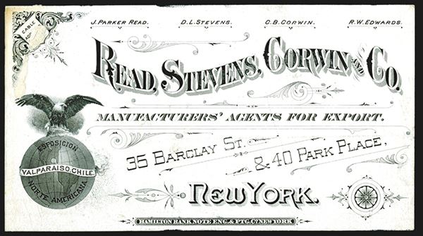 NY. Business Advertising card for Manufacturers' Agents for Export. Intaglio printed by Hamilton BNC. Formerly mounted, paper separation loss at top left corner; fingerprint near lower right.
