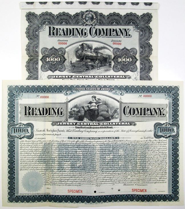 Pennsylvania. 2 pieces: 1901 $1000 Specimen 4% Jersey Central Collateral Gold Coupon Bond in gray; and 1908 $1000 Specimen 4% Jersey Central Collateral Registered Gold Bond in blue-gray. Both have red specimen overprints, 00000 serial numbers, and POCs. Both are in Fine-VF condition with some toning, ABNC. Coupon bond is only listed in specimen format in Cox. (2)