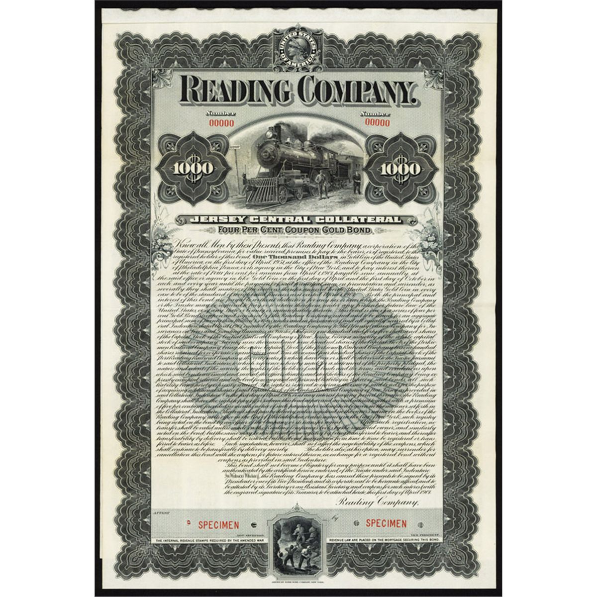 Pennsylvania, 1901, $1000 bond, Specimen, Train, miners below, Blue, ABNC, POC's, XF.