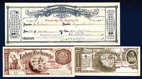 Lot of 3 items. All from Pennsylvania, Includes Kepner, PA, 1897. 5/100 Unit. P-Unlisted, Branch 230, Brunswick Valley Colony of Eastern PA, Kepner, PA, “Capitalization of Labor” on top, S/N 59, AU with one light vertical fold keeping it from CU condition; Reading, PA, 1896. 5/100 Unit. P-Unlisted, Branch 119, S/N 12, Choice XF condition, Also includes a Reading Certificate of Deposit for $1 that had been redeemed ca.1890's. Rare Pennsylvania Branch of labor organization that began as a result of the Labor war of 1894 that engulfed literally the whole nation from railroads to miners.