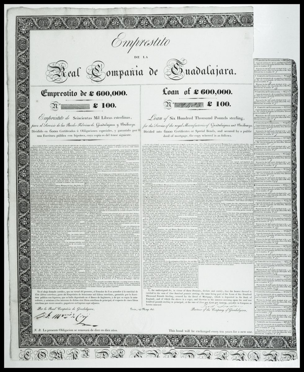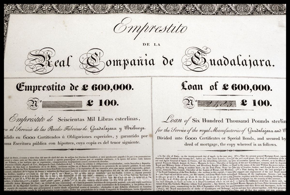 Spain, (Issued in London and Paris), May 14, 1825, £100, I/U, Black on off white paper, Ornate border with classic lettering in title, S/N 2483, 20 coupons originally on this rare bond with 2 removed leaving 18 attached coupons on right border, back is blank, Issued as a part of a "Loan of £600,000 Sterling, for the Service of the Royal Manufacturies of Guadalajara and Ubrihuega - Divided into 6000 Certificates or Special Bonds", 15.5 inches x 18.75 inches, VF condition, Written in Spanish and English, Printer: Paris, Imprimerie De Firmin Didot, Rue Jacob, No.24, Exceptionally early bond. The company which founded in 1824 by the Marquis de Croy merchants (Knight of the Royal Order) and signed by him on the lower left, Peter Adriel (Vice Consul and Knight of the Legion of Honour) and Jean-Marie Laperriere. The company produced textiles. It had the title "Real Compania" (Royal Company). The bond which was issued in 1825 by the Bank of England, had a total volume of 600 thousand pounds. The bond was issued in London and Paris.