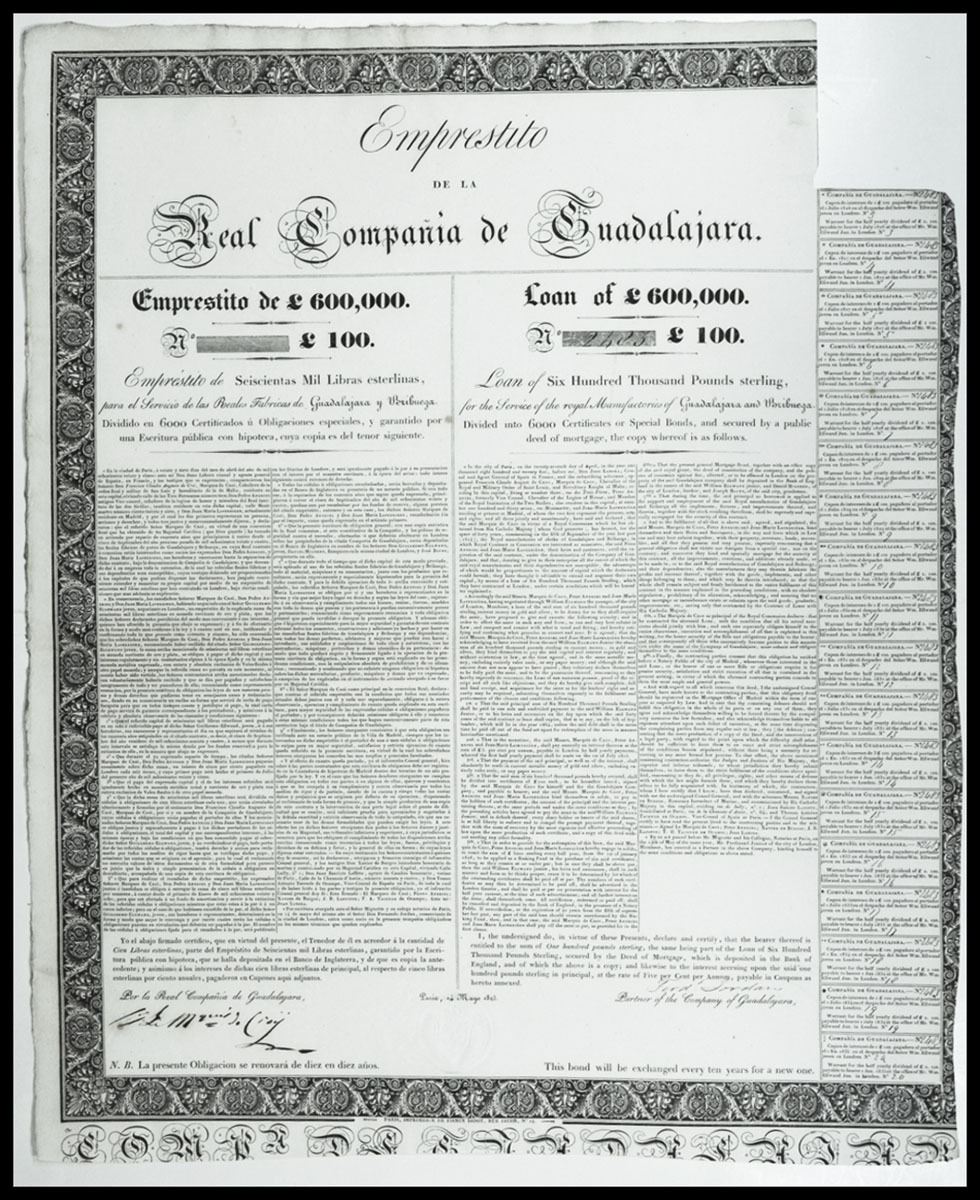 Spain, (Issued in London and Paris), May 14, 1825, £100, I/U, Black on off white paper, Ornate border with classic lettering in title, S/N 2483, 20 coupons originally on this rare bond with 2 removed leaving 18 attached coupons on right border, back is blank, Issued as a part of a "Loan of £600,000 Sterling, for the Service of the Royal Manufacturies of Guadalajara and Ubrihuega - Divided into 6000 Certificates or Special Bonds", 15.5 inches x 18.75 inches, VF condition, Written in Spanish and English, Printer: Paris, Imprimerie De Firmin Didot, Rue Jacob, No.24, Exceptionally early bond. The company which founded in 1824 by the Marquis de Croy merchants (Knight of the Royal Order) and signed by him on the lower left, Peter Adriel (Vice Consul and Knight of the Legion of Honour) and Jean-Marie Laperriere. The company produced textiles. It had the title "Real Compania" (Royal Company). The bond which was issued in 1825 by the Bank of England, had a total volume of 600 thousand pounds. The bond was issued in London and Paris.