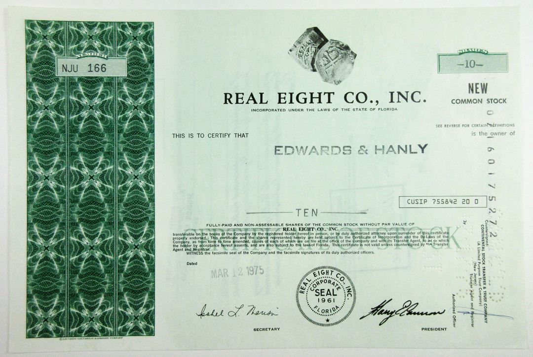 Florida, 1975. 10 Shares I/C Stock Certificate, Black on green border and underprint, Coins at top, Pin punched cancelled along right side, VF-XF condition. The Real Eight Company, also referred to occasionally as “The Real 8 Company”, was incorporated in 1961. From its inception to the mid 1970’s, the Real Eight Company recovered the lions share of the precious treasure that was not salvaged by the Spanish after the 1715 Fleet was lost in a hurricane of that year. In the early 1960’s, ahead of everyone else, the company was first to obtain leases located about the State of Florida which gave the company sole permission to salvage the wreck sites of the Fleet. Under the protection of these leases the company was widely recognized as the leader in recovery efforts. The company was dissolved in 1984.