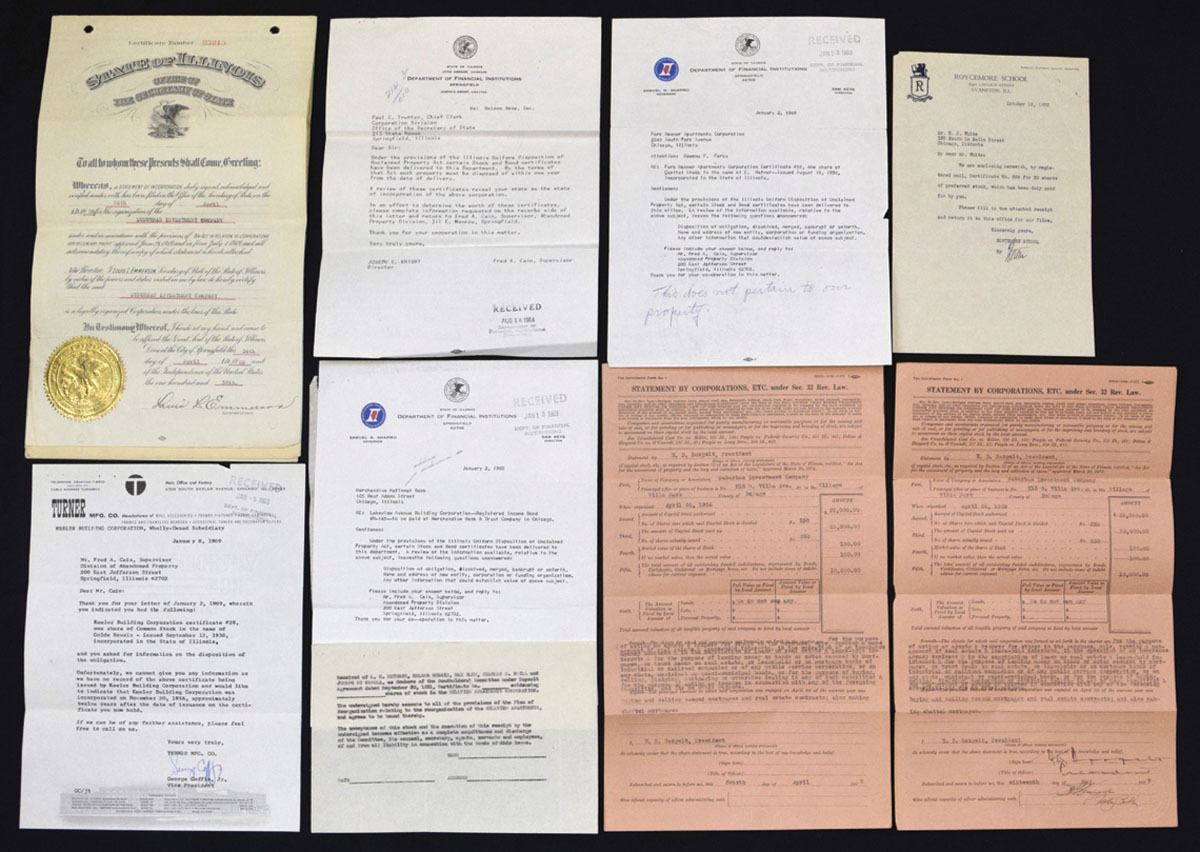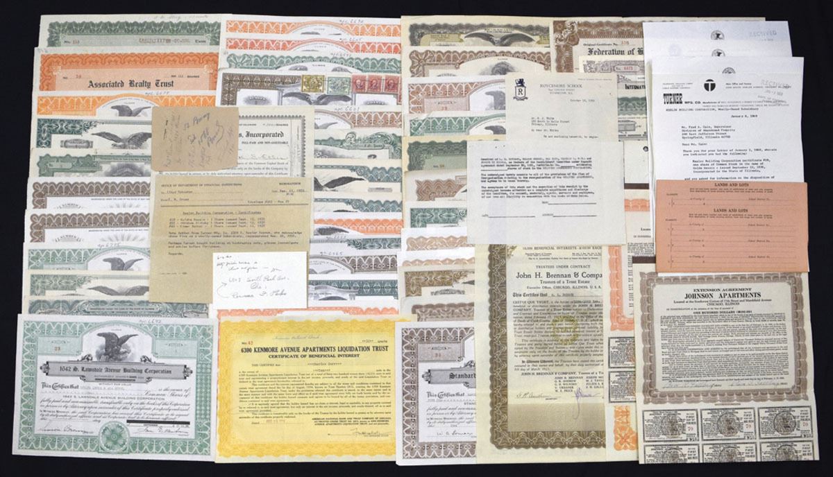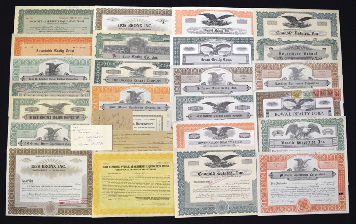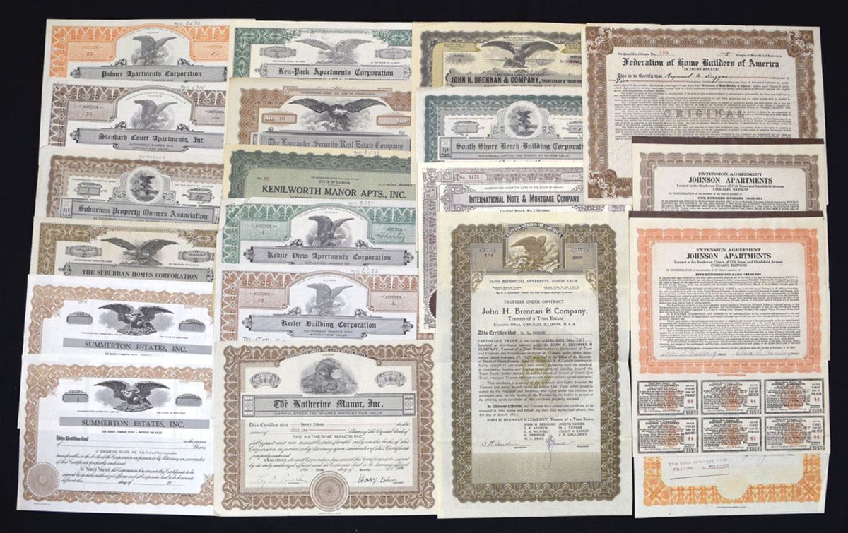 Various States, ca.1920-60s. Lot of 40+ stock certificates and supporting documents, including 4 Serial #1 certificates, issued by U.S. real estate and apartment corporations, Includes: Associated Realty Trust, 1938 Bronx Inc., Penn Zone Realty Co., Michigan-Chestnut Building Corp., Park Manor Apartments Corp., Jefferson Apartments Inc., Rowal Realty Corp., Roselle Properties Inc., Millview Apartments Corp., Kenmore Avenue Apartments Liquidation Trust, and others. Certificates display classic engraved eagle and building motifs, bold borders, and a range of colors including green, orange, and brown. Complementing the certificates are extension agreements, beneficial interest certificates, trust indentures, and corporate correspondence, including filings with the Illinois Department of Financial Institutions. Together, this group documents both the financing and development of American apartment houses, building trusts, and property ventures across mid-20th century urban growth. Condition ranges from Good to VF+, with typical folds, edge wear, and some stamped or annotated examples. (40+). Sold “AS IS” no returns accepted. Unsearched for revenue stamps or signatures.