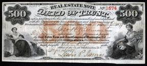 Washington, D.C., 1877. $500. P-Unlisted. Issued note or banknote. Black border, titles and text with Allegorical women on left and right and "500" underprint in red in middle, back green with text that states that 1000 notes of $500 denomination are secure by 75,000 acres of land. Title states "Real Estate Note .....Secured by Deed of Trust" and is payable at 7% interest. Evidently a circulating bond, since it is banknote sized or a small bond (I think the former). Condition appears VF but there are approximately 20 very small pin holes on the left side of note that are difficult to see unless held up to light. Attractive and scarce high denomination obsolete banknote. Printed by Excelsior BNC located in Washington, D.C.