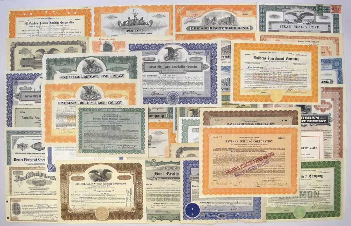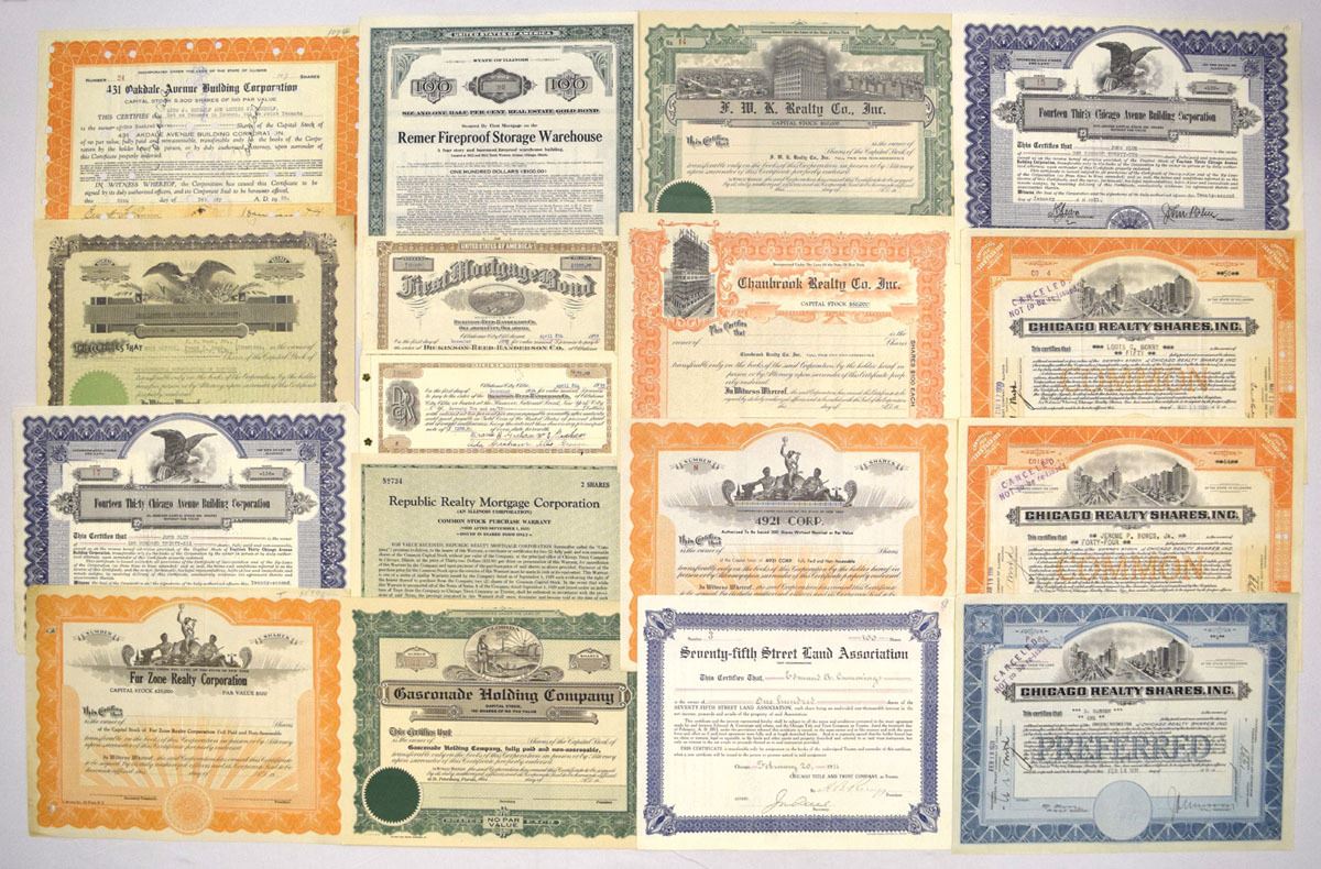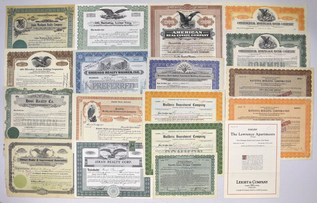 Various States, ca.1900-40s. Lot of 30+ I/U and I/C Stock and Bond Certificates relating to real estate, mortgage, land development, apartment financing, and construction companies. Attractive and diverse group with engraved buildings, allegorical figures, and eagle vignettes. Includes Continental Mortgage Bond Co.; Builders Investment Co.; Chicago Realty Shares Inc.; First Mortgage Land Co.; Franklin Realty & Construction Co.; Jeran Realty Corp.; Union Workmen Realty Co.; Elkhart Realty & Improvement Assn.; Remer Fireproof Storage Warehouse; American Real Estate Co.; Guzornade Holding Co.; Ravenna Building Corp.; 431 Oakdale Avenue Building Corp.; 4041 Milwaukee Avenue Building Corp.; 75th Street Land Assn.; Yool Realty Co.; Manhattan Avenue Corp.; The Lawrence Apartments bond; 1921 Corp.; Chanbrook Realty Co.; and others. Conditions range from VF to AU, with typical folds, toning, and handling. (30+). Sold ‘AS IS’ no returns accepted.