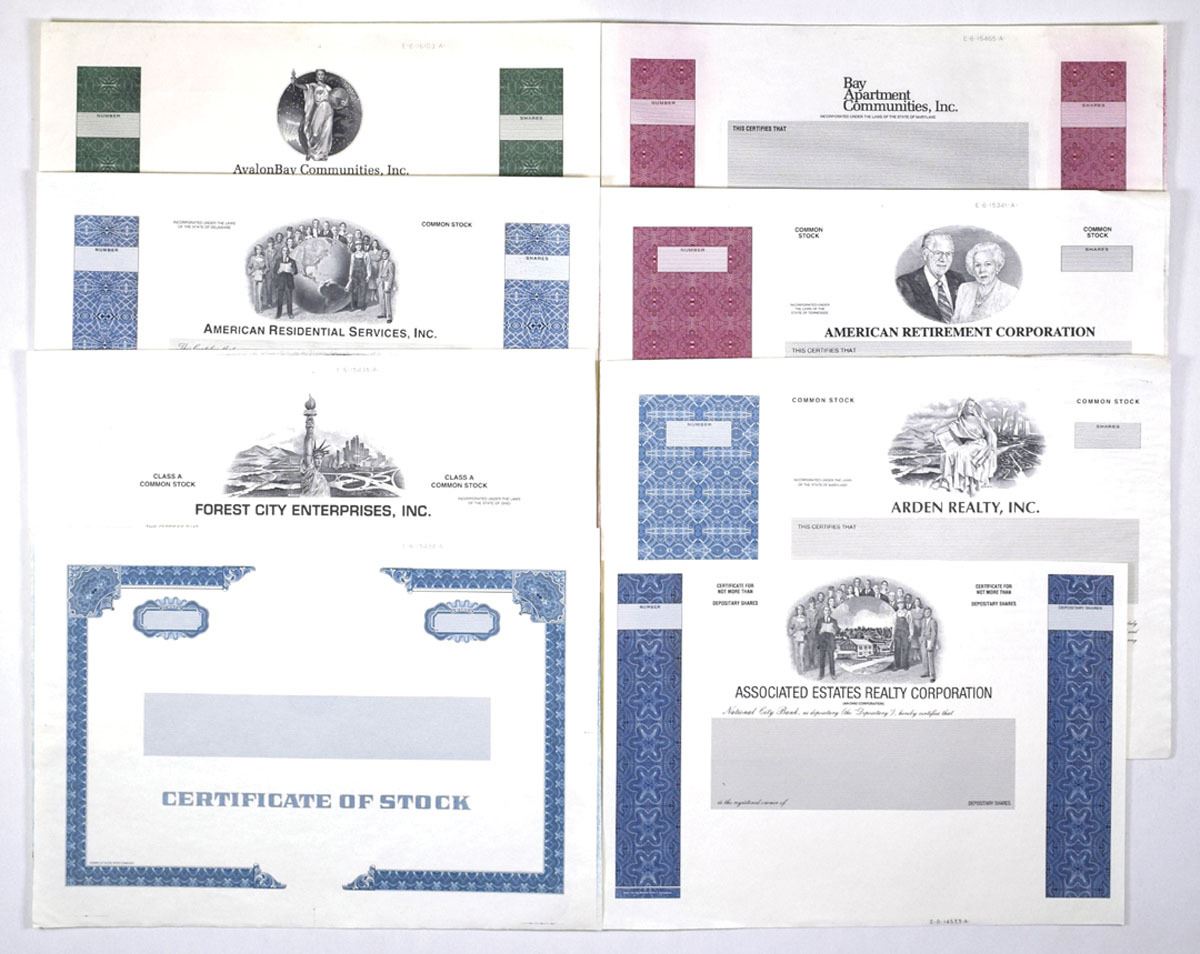 Lot of 8 items, featuring AvalonBay Communities, Inc., a major U.S. real estate investment trust (REIT) specializing in apartment communities, specimen with green border; Bay Apartment Communities, Inc., a multifamily residential REIT later merged into AvalonBay, specimen with red border; American Residential Services, Inc., a provider of home repair and maintenance services including HVAC and plumbing, specimen with blue border; American Retirement Corporation, a developer and operator of senior living communities, specimen with red border; Forest City Enterprises, Inc., a prominent national real estate development and property management company, represented by two undated progress proofs with no colored borders; Arden Realty, Inc., a REIT focused on commercial office properties in the western U.S., specimen with blue border; and Associated Estates Realty Corporation, a multifamily REIT with a portfolio of apartment communities across the U.S., specimen with blue border. All certificates are face-only stock certificate proofs or progress proofs with blank reverses and were printed by the American Bank Note Company unless otherwise noted; overall condition is Very Fine to Uncirculated (8).
