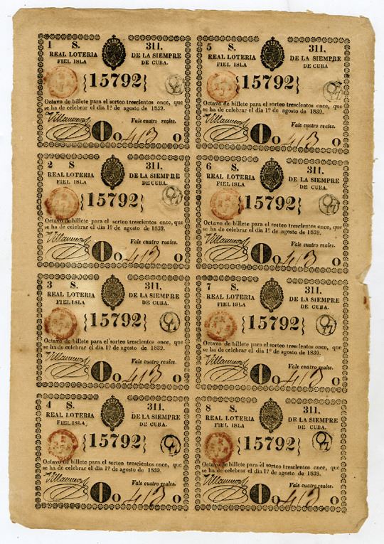 Cuba, 1839. Uncut sheet of 8 lottery tickets. Black printing, and each with hand stamps and numbers. Choice Very Fine with toning.