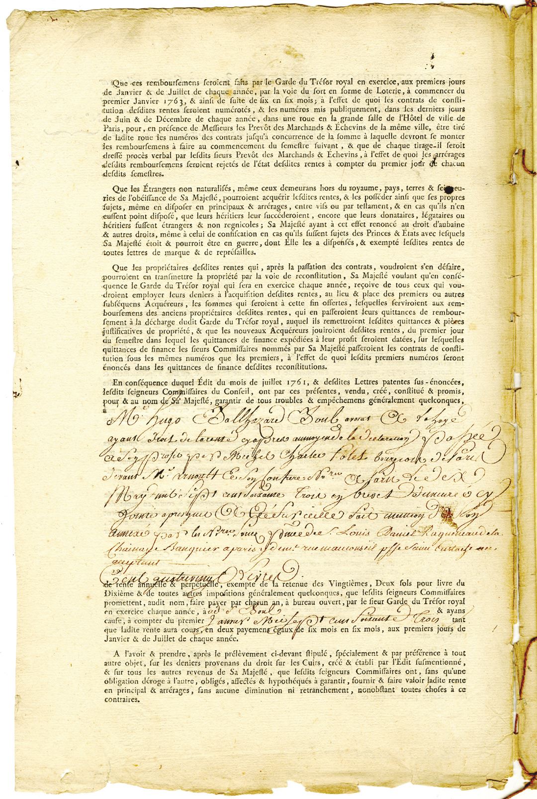 France, 1763. Several page typeset and handwritten document in French. Mentions the King (Louis XV), his advisors, notaries, keeper of notes and keepers of His Majesty at the "Chatelet de Paris." This piece is a reconstitution of annuities at 3% on the income coming from the duties on leathers, as well as other revenues for the king. Hereditary payments are also discussed at length. Black text with dark brown writing, black seal at top center. Fine condition with damage to margins, but in incredible condition for its age. Rare and possibly unique piece of French financial history that pre-dates the French Revolution by over 20 years. The King of France at the time was Louis XV (15 February 1710 _ 10 May 1774), known as Louis the Beloved, who was King of France from 1 September 1715 until his death in 1774. He succeeded his great-grandfather Louis XIV at the age of five. His reign of almost 59 years (from 1715 to 1774) was the second longest in the history of France, exceeded only by his predecessor, Louis XIV, who had ruled for 72 years (from 1643 to 1715). In 1748, Louis returned the Austrian Netherlands, won at the Battle of Fontenoy of 1745. He ceded New France in North America to Great Britain and Spain at the conclusion of the disastrous Seven Years' War in 1763. He incorporated the territories of the Duchy of Lorraine and the Corsican Republic into the Kingdom of France. Historians generally criticize his reign, citing how reports of his corruption embarrassed the monarchy, while his wars drained the treasury while producing little gain. His grandson and successor Louis XVI would inherit a kingdom in need of financial and political reform, which ultimately would lead to the French Revolution of 1789.
