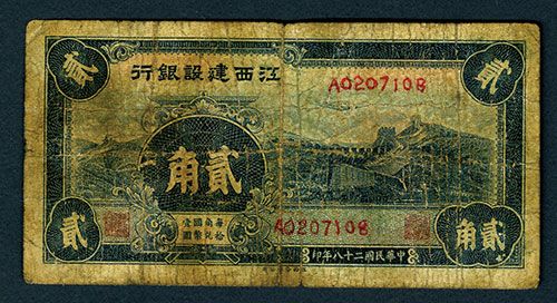 20 Cents, P-S1082F (S/M#C90-11), Issued, Blue with Great Wall at right, back blue and brown, Choice VG to Fine condition.